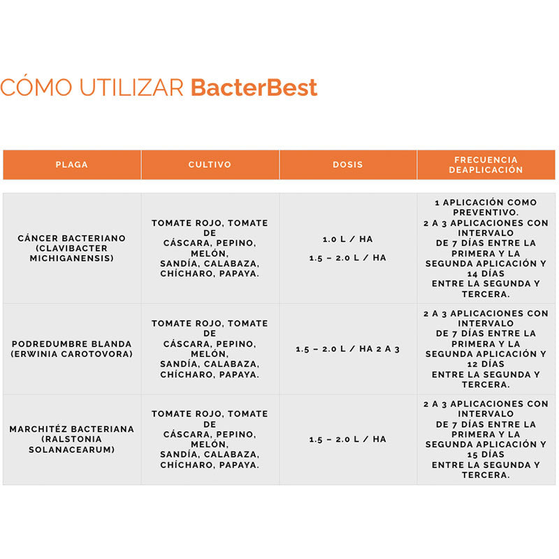 Se puede utilizar de manera preventiva contra las enfermedades bacterianas que pueden influir en la reducción de la producción, contribuyendo a correcto desarrollo de los frutos con mayor calidad y sanidad.